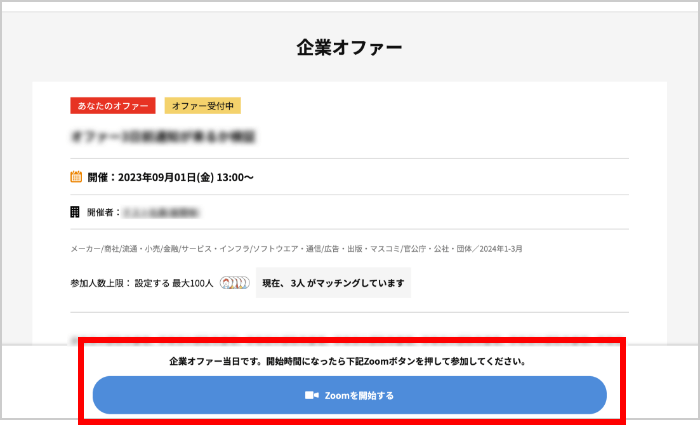 「オファー当日です」通知メール。もしくはオファー詳細画面から「Zoomを開始する」ボタンを押してください。※1日以内にオファーを作成〜開催された方には「オファー当日です」通知メールは送信されません。