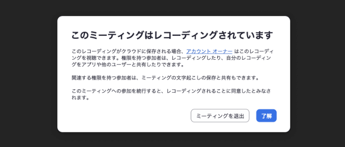 この画面が出たら「ミーティングを起動」してZoomアプリを起動してください。Zoom通話は運営によりレコーディングさせていただきます。「了解」を押してミーティングを始めてください。