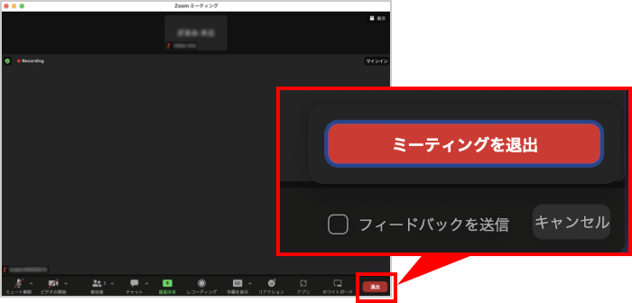 Zoomメニュー内の「退出する」ボタンから通話を終了できます。
